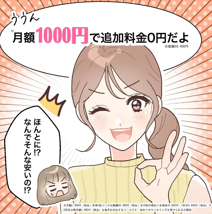 ※月額1,000円(税込)全身3回コースは総額59,400円(税込)を36回分割払いを頭金20,000円、1回目4,400円(税込)で2回目以降月額1,000円(税込)を毎月お支払するコースです。※初めてカウンセリングを受けられる方限定。